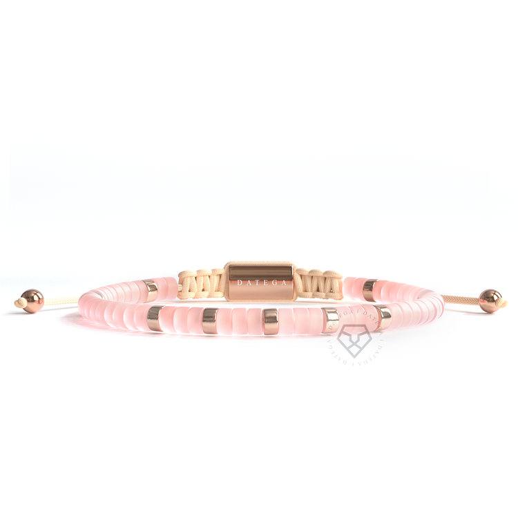 Este hermoso diseño está elaborado con piedras cuarzo rosado en corte tipo radiant combinadas con espaciadores bañados en oro rosado de 18kt; esta pulsera cuenta con cierre de cordón ajustable de hilo de 1.2 mm protegido con una cera especial que permite proteger las fibras.