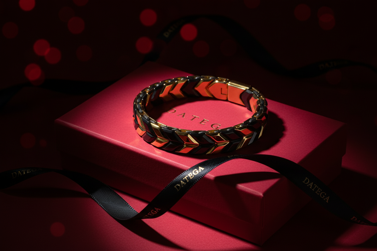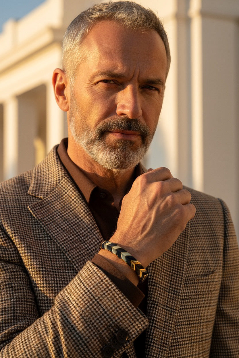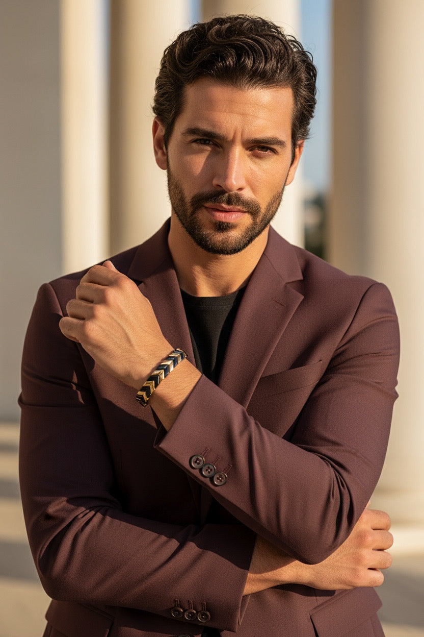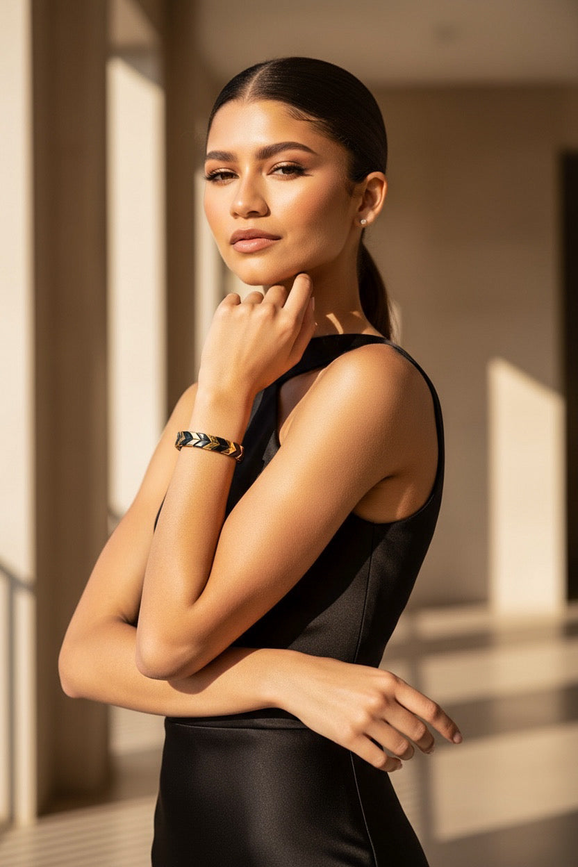 La pulsera Chevron combina eslabones gruesos en tono dorado brillante con un contraste profundo en negro satinado mate.