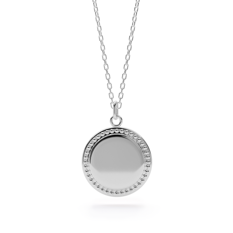 Nuestro dije de moneda con bisel de puntos está elaborado en plata .925 en una medida de 10 mm.