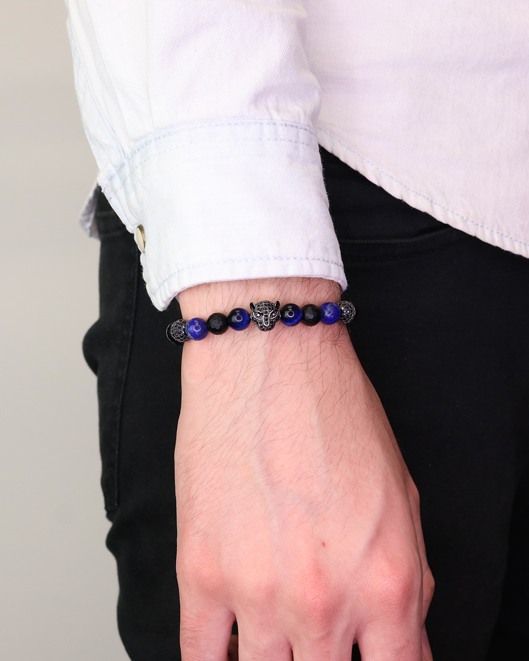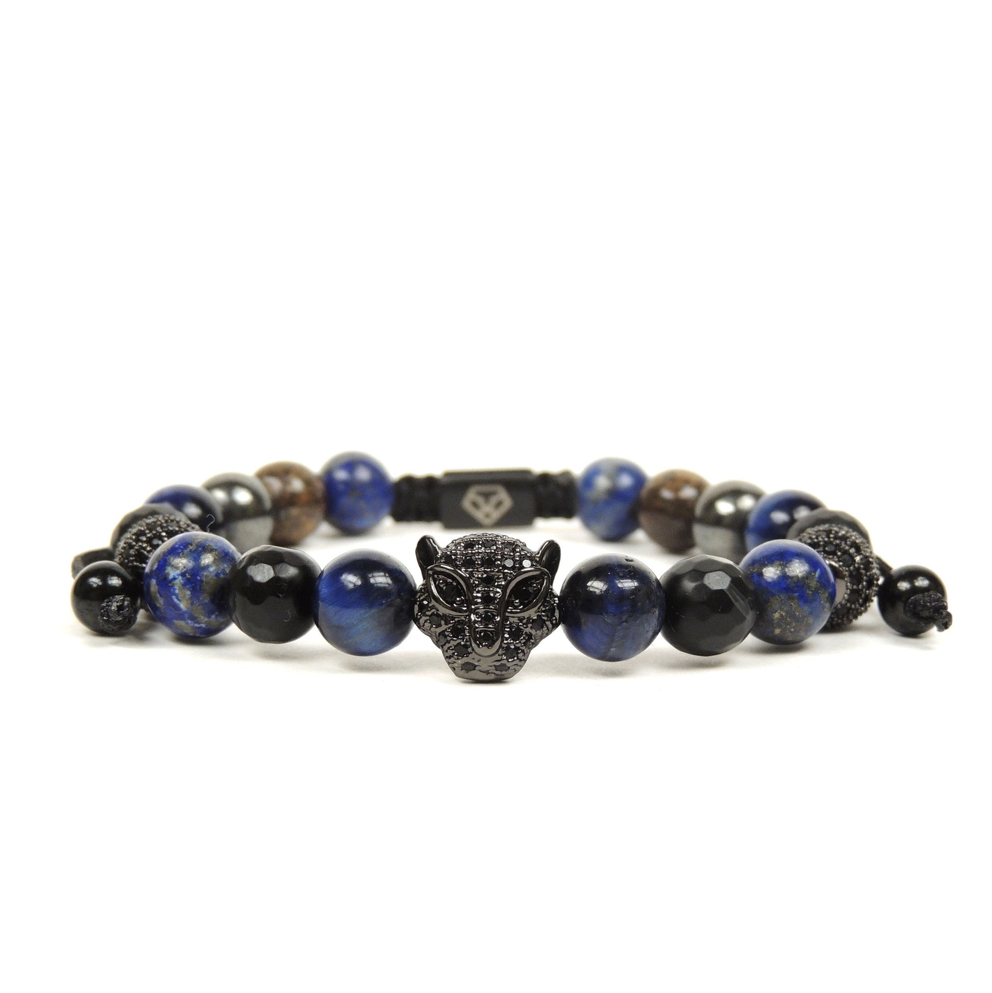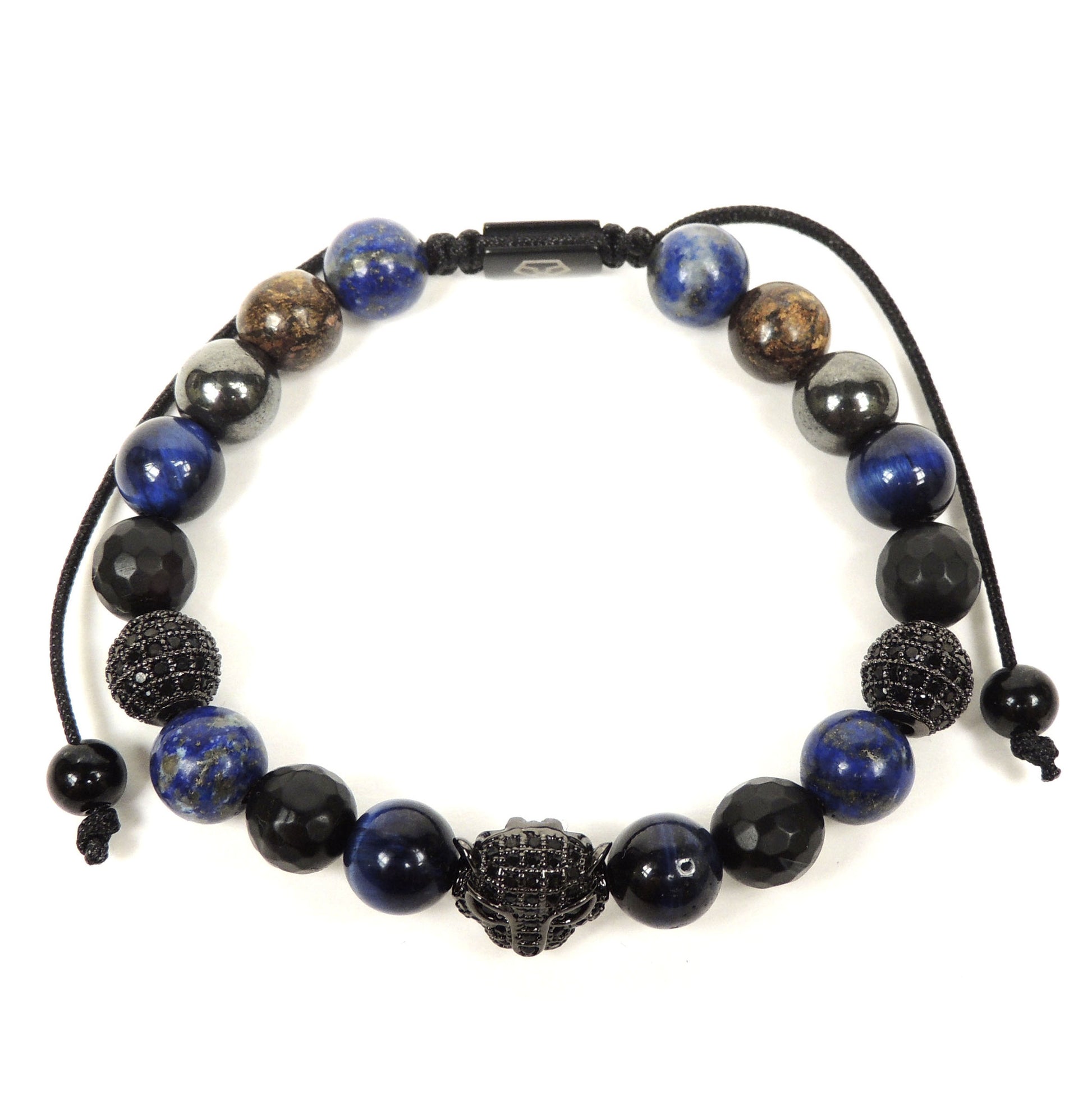 Este diseño en tonos tierra con un sutil toque de color está elaborado con piedras ágata facetada, ojo de tigre azul, lapis lazuli, broncita y hematita de 8 mm, combinadas con nuestro clásico dije de jaguar y esferas de 8 mm bañadas en rodio con insertos de zirconia negra; cierre de cordón ajustable de hilo de 1.2 mm protegido con una cera especial que permite proteger las fibras.