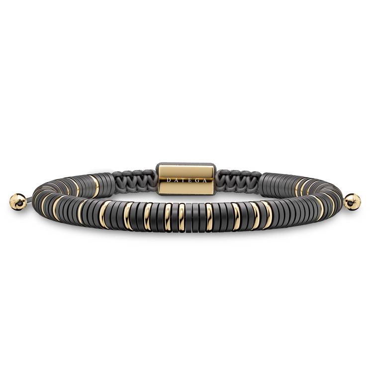 Fresco y elegante diseño elaborado con anillos de caucho en color negro, combinados con anillos bañados en oro amarillo de 18kt; esta pulsera cuenta con cierre de cordón ajustable de hilo de 1.2 mm protegido con una cera especial que permite proteger las fibras.