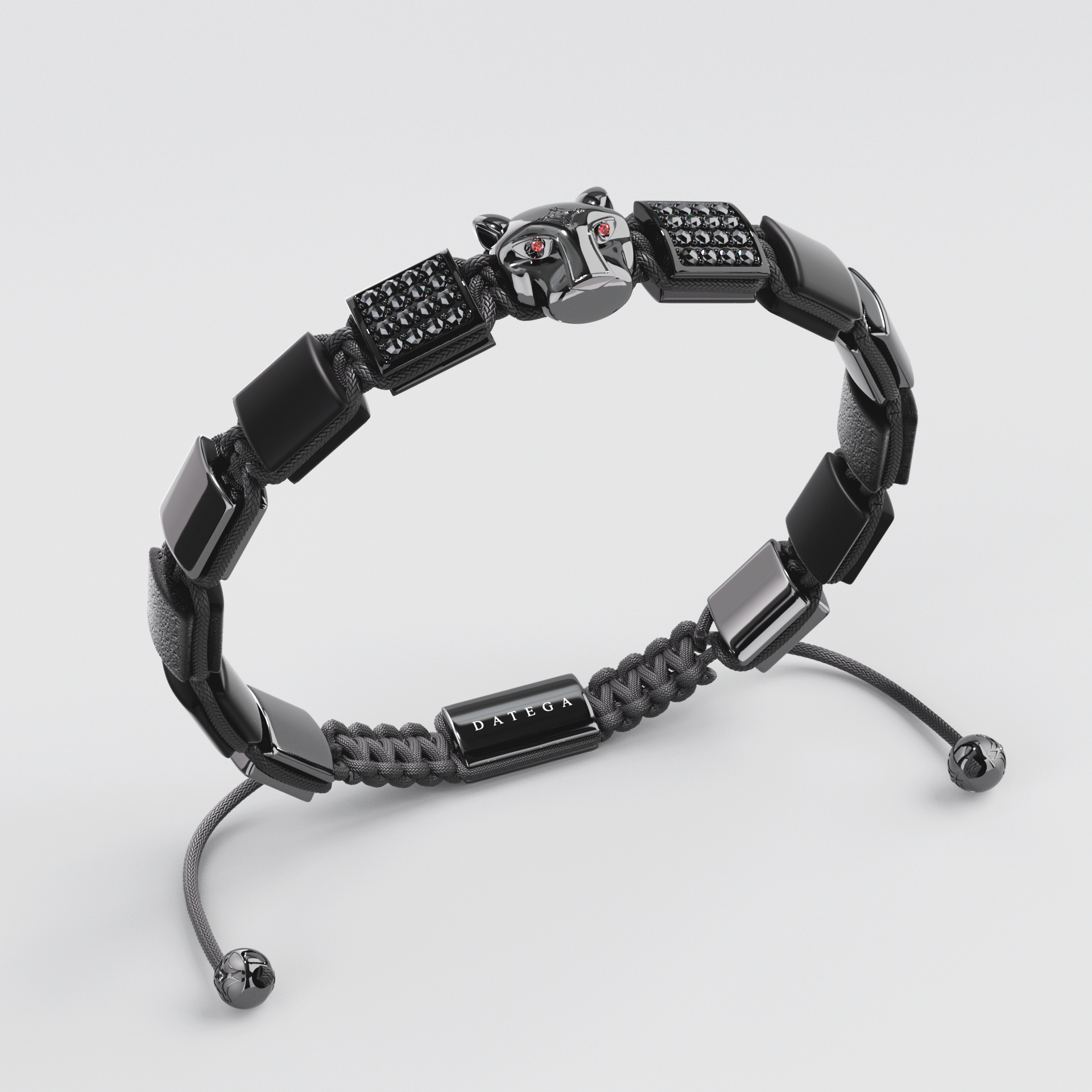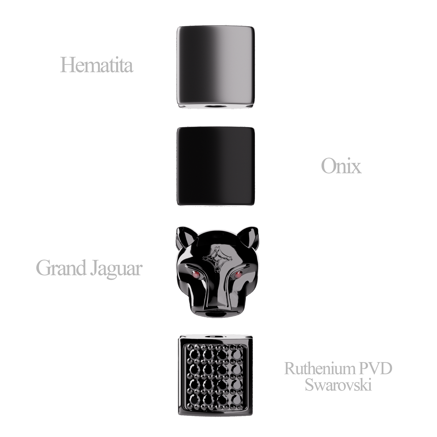 Cristales Swarovski negros incrustados manualmente (Pavé) sobre la cara del jaguar. El acabado en Rutenio elimina el brillo de la plata tradicional, entregando una estética "Gunmetal" industrial y resistente.