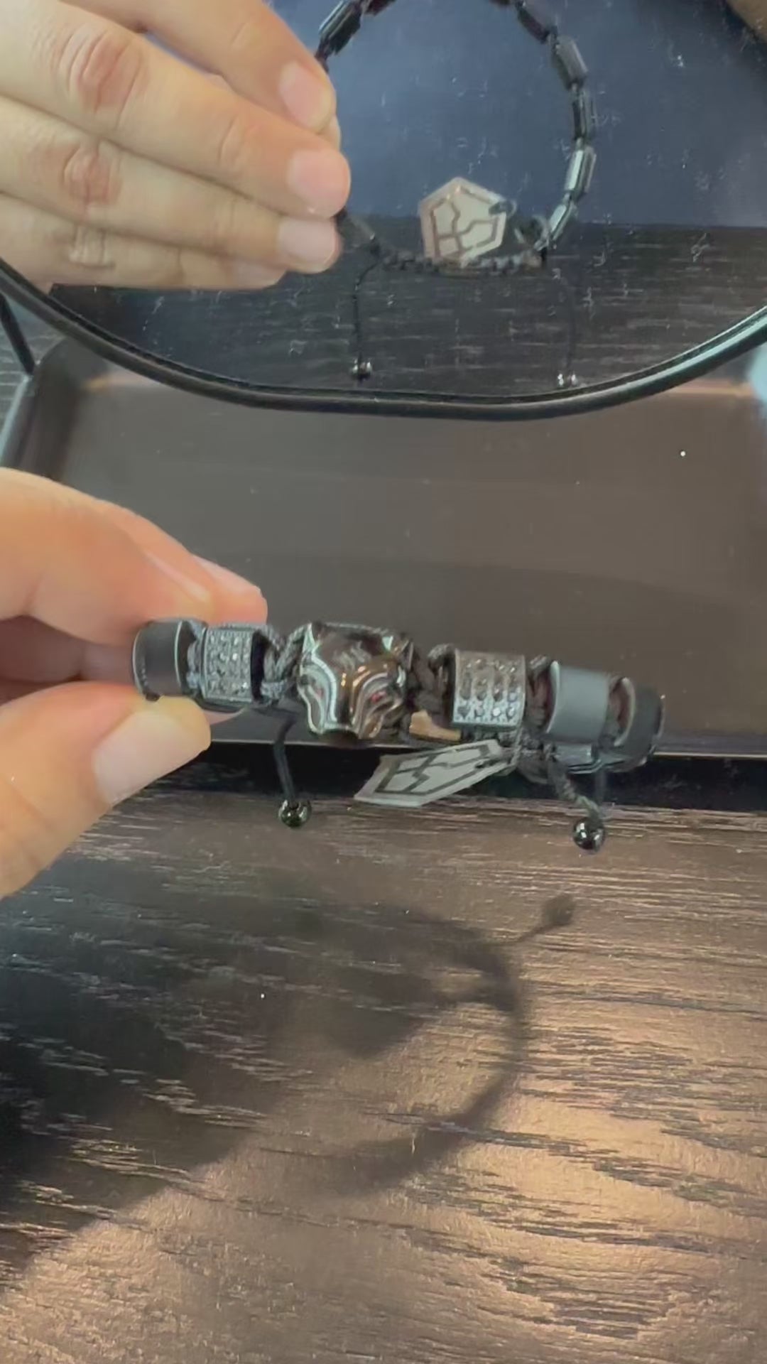 Bloques geométricos de Onyx natural mate. Piedra volcánica que aporta peso y frialdad táctica. Contrastada con el "Fire Edition" (hilo rojo) para romper la monocromía con un golpe visual agresivo.