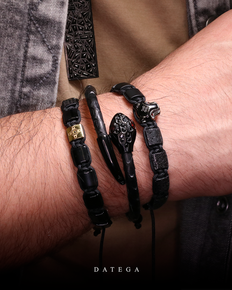 Nuestro brazalete de diseño Star, el más renombrado de nuestra marca, personifica la búsqueda de la mejora personal y el gusto refinado, simbolizando la atención al detalle y la búsqueda incansable de la perfección. Acompañándolo, el brazalete Serpente, simboliza la transformación, la renovación y la sabiduría, mientras que el Grand Jaguar, con sus cristales Swarovski en los ojos, representa el poder, la valentía y la protección. La combinación de estos brazaletes evoca un equilibrio entre la mejora personal, la transformación positiva y el poder protector, ofreciendo una expresión completa de la fuerza, la sabiduría y la valentía. ¡Usar estos brazaletes juntos es un recordatorio de cómo la perfección, la transformación positiva y el poder se unen para forjar un camino hacia la grandeza!