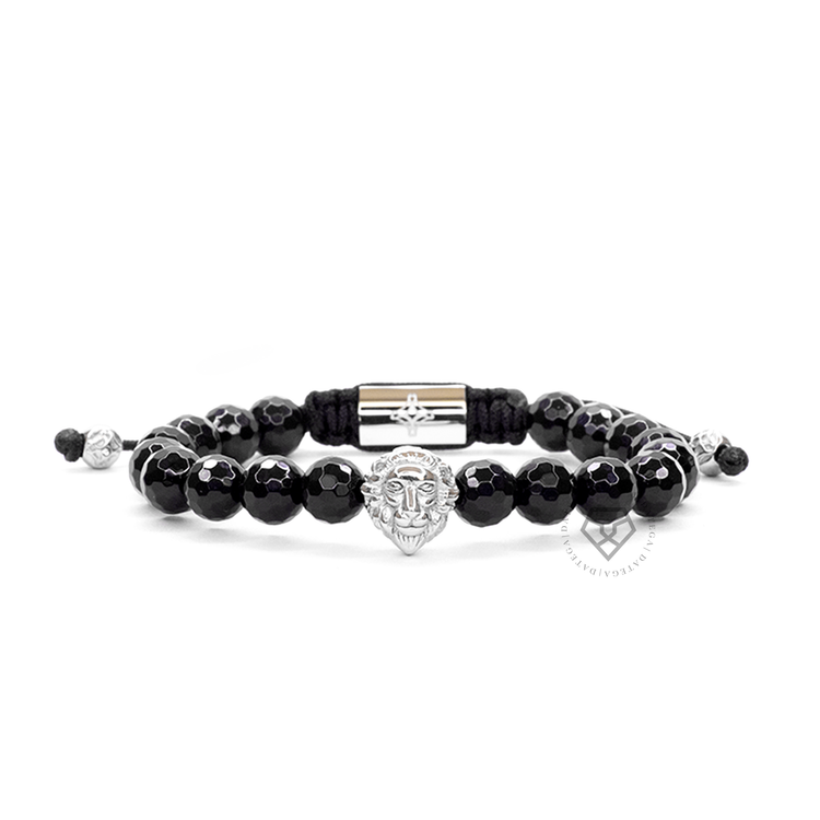 Este diseño sencillo y pulcro está elaborado con piedras ágata facetada de 8 mm, combinado con nuestro dije de león bañado en oro blanco de 18kt; cierre de cordón ajustable de hilo de 1.2 mm protegido con una cera especial que permite proteger las fibras.